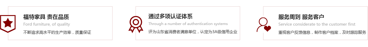 公司全體員工緊緊牢記“福特家具,貴在品質(zhì)”的承諾,本著“以質(zhì)量求生存,以信譽(yù)求發(fā)展”、“誠(chéng)實(shí)守信”的企業(yè)理念,力爭(zhēng)“創(chuàng)名優(yōu)企業(yè),鑄優(yōu)質(zhì)品牌”,在全公司上下兢兢業(yè)業(yè)、認(rèn)認(rèn)真真,嚴(yán)格要求自己,不斷追求自已,不斷追求更高水平的生產(chǎn)效率,我公司注重質(zhì)量管理,先后通過了國(guó)際質(zhì)量管理體系ISO9001認(rèn)證、國(guó)際環(huán)境管理體系14001認(rèn)證、職業(yè)健康安全管理體系OHSAS18001認(rèn)證,公司注重品牌建設(shè),先后注冊(cè)了“世紀(jì)福特”、“杰福特”、“伯爵”三個(gè)系列商標(biāo),公司連續(xù)多年被煙臺(tái)市工商局授于“市級(jí)守合同重信用企業(yè)”稱號(hào),連續(xù)被山東省工商局授于“省級(jí)守合同重信用企業(yè)”稱號(hào),被山東省企業(yè)信用與社會(huì)責(zé)任協(xié)會(huì)評(píng)為“優(yōu)秀企業(yè)會(huì)員”稱號(hào),連續(xù)被煙臺(tái)市消費(fèi)者協(xié)會(huì)評(píng)為消費(fèi)者滿意單位,連續(xù)被山東省消費(fèi)者協(xié)會(huì)評(píng)為第八屆、第九屆山東省消費(fèi)者滿意單位,被認(rèn)定為AAA級(jí)信用企業(yè),隨著社會(huì)環(huán)保意識(shí)的不斷提高,公司2014年4月順利通過了中國(guó)環(huán)境標(biāo)志產(chǎn)品認(rèn)證,2015年8月順利通過了中國(guó)質(zhì)量認(rèn)證中心CQC環(huán)保產(chǎn)品認(rèn)證,并于2015年12月被評(píng)為“山東省著名商標(biāo)”榮譽(yù)稱號(hào)。